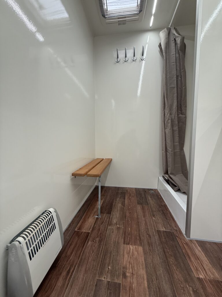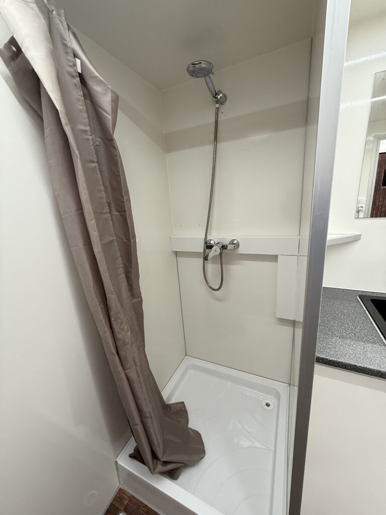 Ausgestattet mit einer Dusche inklusive Duschvorhang, einem WC mit Papierrollenhalter und einem Waschtisch mit großem Spiegel, bietet es alles, was Sie benötigen. Eine Sitzbank, Kleiderhaken, Heizung, Beleuchtung, Dachluke und Steckdosen sorgen für zusätzlichen Komfort und Bequemlichkeit.